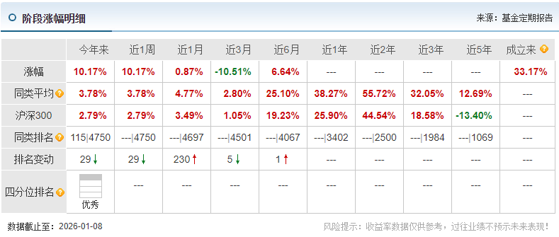 首先它的业绩表现足够亮眼,它是去年4月成立的,截至2026年1月8日,不到一年的时间涨幅就达到了33.17%,在板块震荡的大环境下,这样的收益水平已经远超我的预期,也证明了它跟踪指数的能力。