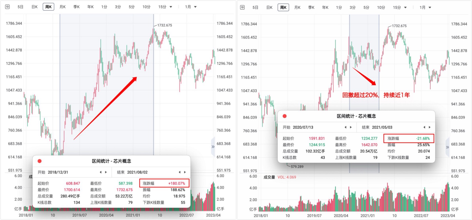 再看半导体。它的超级周期,则源于“国产替代”这个时代命题。2019年之后,国产订单如雪片般飞来。到了2020年,全球陷入“缺芯”潮,晶圆厂满产满销,相关公司的业绩增速动辄50%甚至100%。股价自然水涨船高。但它的上涨也绝非一帆风顺。2020年7月,当国家大基金开始减持的消息传来,板块阴跌了近一年,跌幅超过20%。当时市场上到处都是“科技泡沫破裂”、“行情见顶”的声音。可事后看,那根本不是山顶,只是半山腰的一次歇脚。到了2021年下半年,全球芯片短缺加剧,从手机到汽车,下游需求极其旺盛,供需严重错配。于是,指数在短短半年里再次拉升了40%。直到2022年,行业库存高企、渠道压力巨大,再加上美元加息,这一轮周期才真正走完。