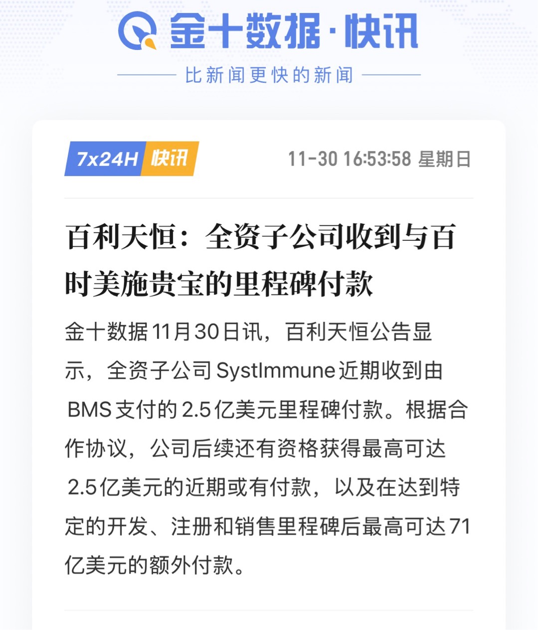 2025年,被许多人看作是中国创新药真正腾飞的元年。行业正处在“出海爆发”和“国内刚需释放”双重驱动的产业扩张初期。标志性的事件正在发生:就在2025年11月底,百利天恒公告收到了来自跨国药企百时美施贵宝(BMS)的第一笔2.5亿美元里程碑付款。这不仅仅是单个公司的喜讯,更是一个强烈的信号,意味着中国创新药的研发成果正在被全球市场真金白银地认可和购买。可以预见,未来这样的BD(业务发展)订单会越来越多。同时,国内还有大量创新药管线处于临床一期、二期,研发储备非常深厚。这分明是产业快速扩张的前半段特征,而不是尾声。