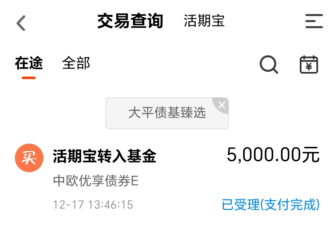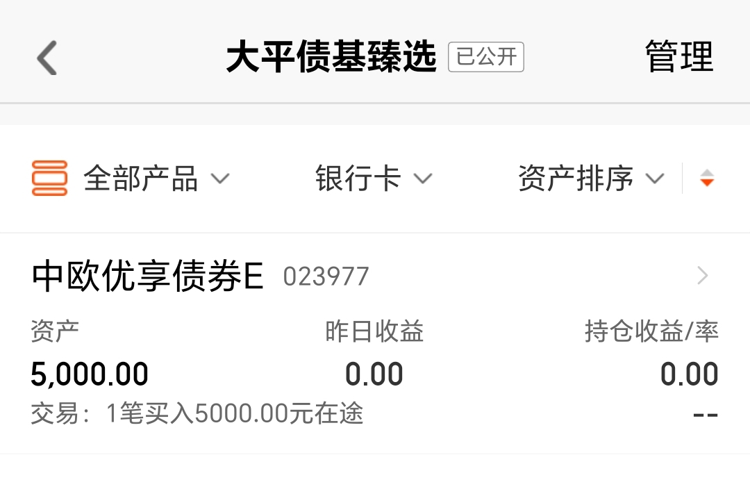 今天我买入$中欧优享债券E(OTCFUND|023977)$5000块钱。