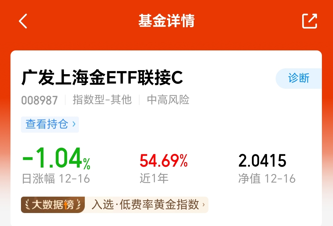 这个基金跟踪国内金价走势,近1年收涨54.69%,我中长期继续看好,趁着今天反弹我继续定投加仓。