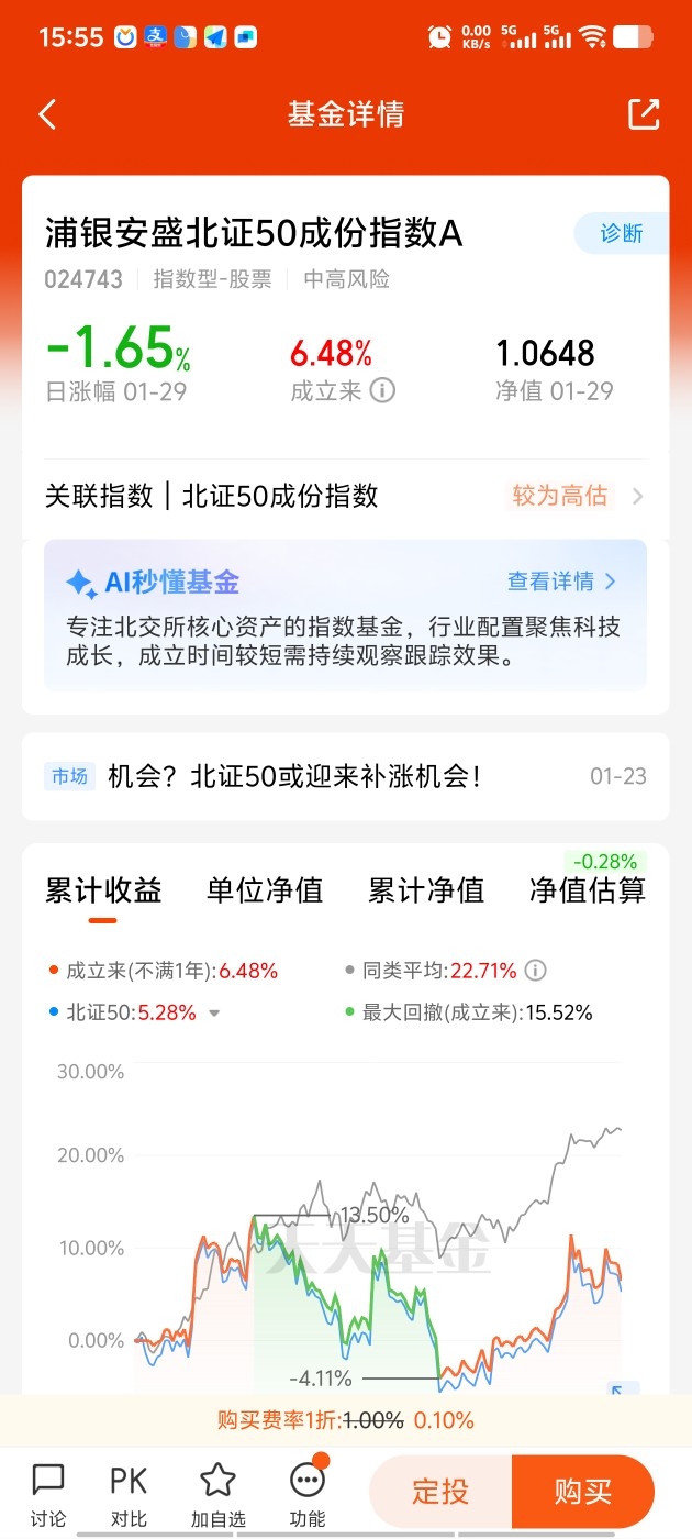 回调就是机会啊,当前北证50也开始发挥了,可以搭配着布局能够互补,$浦银安盛北证50成份指数A$不限购操作也方便啊