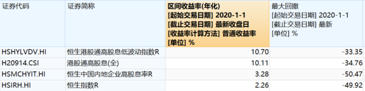 自2020年初以来,恒生港股通股息低波动R(全收益指数)累涨80.85%,区间年化涨幅10.70%,最大回撤-33.35%,风险收益比优于同类港股红利类指数。