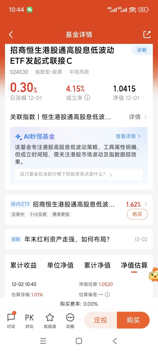 $招商恒生港股通高股息低波动ETF发起式联接C$ 这只聚焦港股红利的指数基金。紧密跟踪恒生港股通高股息,低波动指数,聚焦的都是稳定性更好的港股红利资产。长期表现的稳定性一直不错。昨天上涨了0.3%。今天的估值上涨了1.01%。而且同类产品不但低费率,还有定期评估分红机制,长期持有,体验感更好。我准备用来做长期的底仓配置。