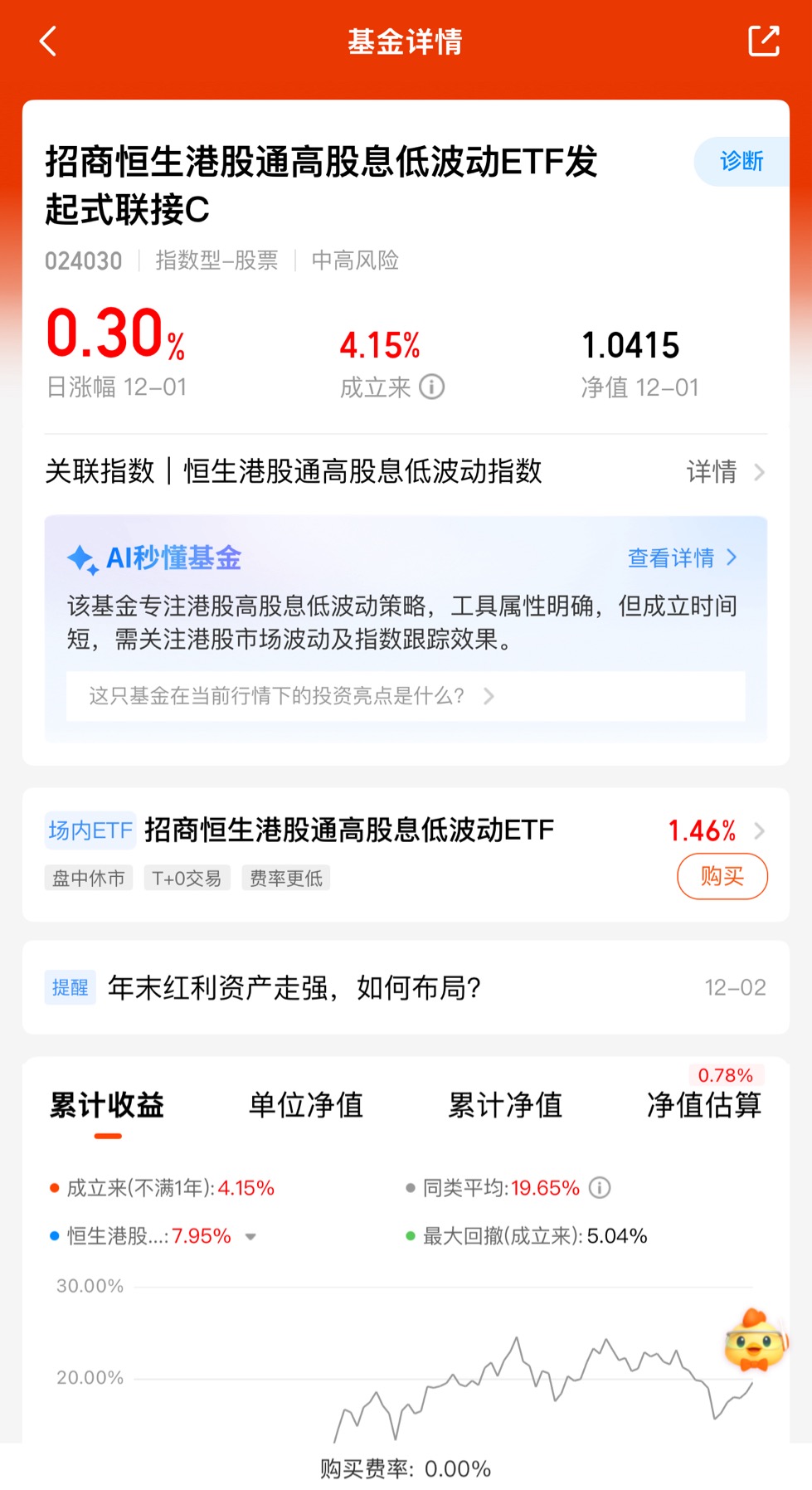 今日港股高股息低波板块表现突出,$招商恒生港股通高股息低波动ETF发起式联接C$ 早盘高开高走,截至发稿涨幅近0.78%,领跑同类,凸显其在震荡市中的防御与收益双重属性。