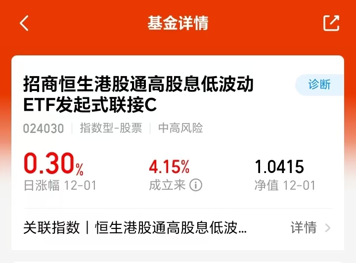 最近看到$招商恒生港股通高股息低波动ETF发起式联接C(OTCFUND|024030)$感觉还不错,6%高股息率比A股红利更实在,持仓集中金融、地产等稳当领域,跟踪指数不瞎调仓。综合费率低于同类,还有定期评估分红,现金流稳定。叠加上市公司分红提升,利率下行背景下红利资产性价比不错的。
