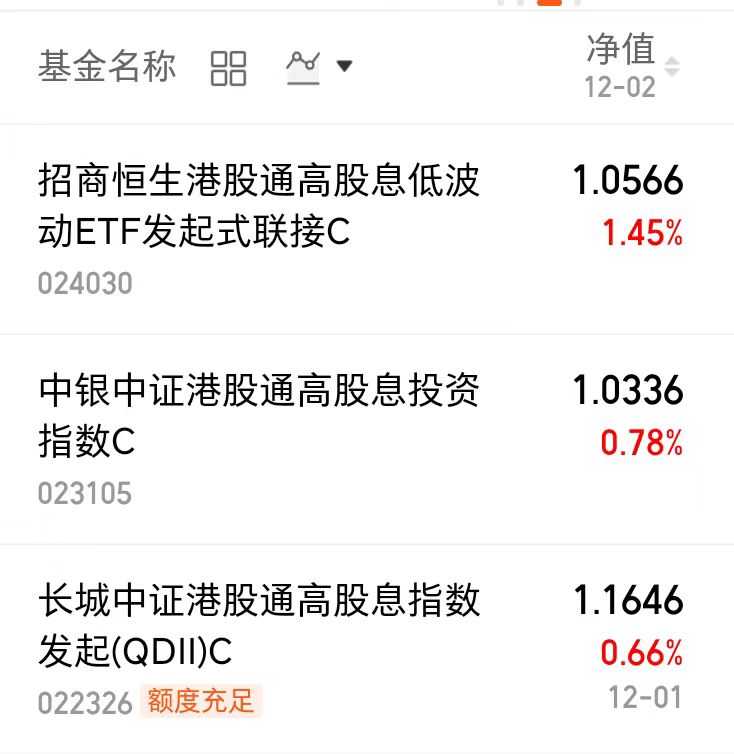 $招商恒生港股通高股息低波动ETF发起式联接C(OTCFUND|024030)$昨天上涨1.45%