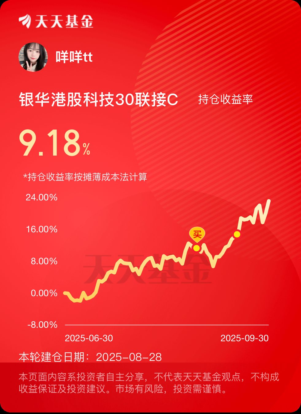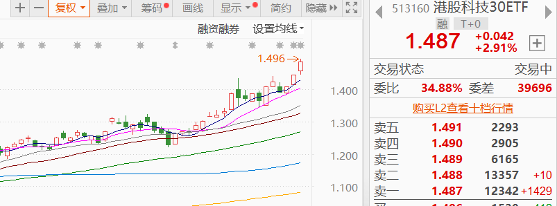 咩咩早前布局的 $银华港股科技30联接C(OTCFUND|024038)$其跟踪的场内ETF-银华恒生港股通中国科技ETF早盘一度涨超3%并创下反弹新高,我今天乘胜追击再加5000元!