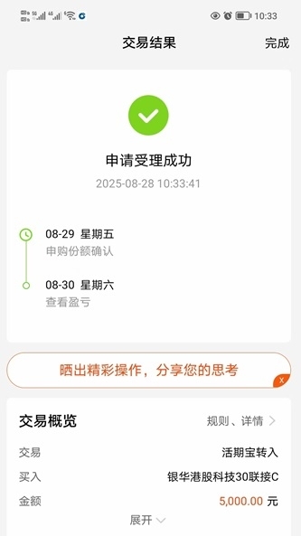 港股科技汇聚了中国AI产业链的核心企业,涵盖上游半导体、中游互联网大模型、下游消费电子与传媒应用等。恒生港股通中国科技指数中,AI直接相关行业权重高达76%,头部企业资本开支激增,推动技术商业化落地加速,AI产业的快速发展将为恒生港股通科技带来巨大的红利。2025年以来,南向资金持续流入港股,带动港股市场活跃度大幅提升,港股通资金也不断流入科技板块。。我看好恒生港股通中国科技指数接下来的发展,今天大力低吸银华港股通科技30ETF联接C(024038)5000元,后面也会继续寻找机会加仓。最后我晒一下买入操作记录:
