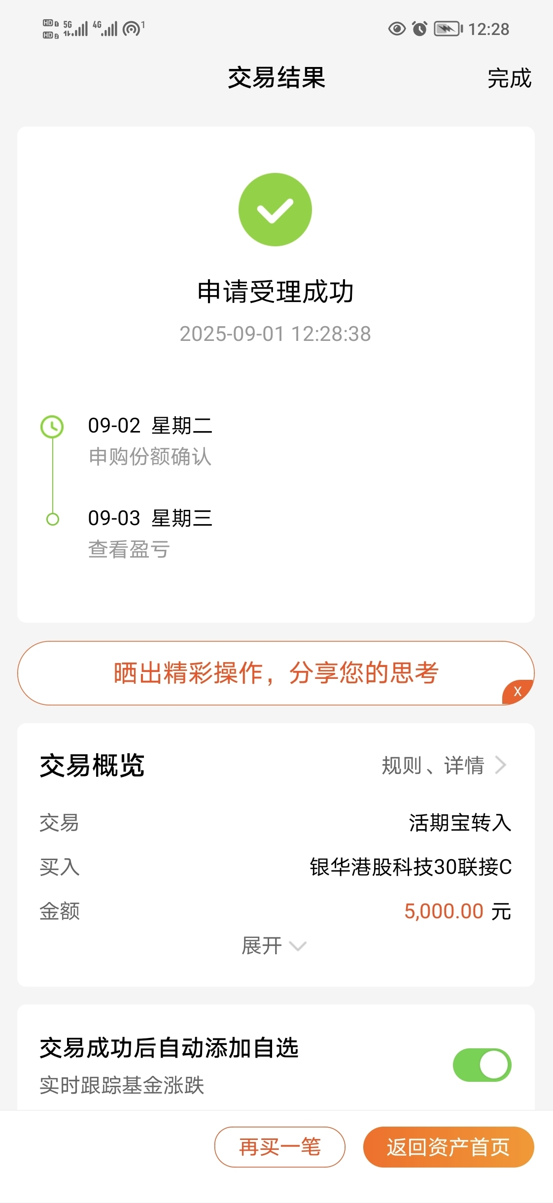 我看好恒生港股通中国科技指数接下来的发展,今天大力加仓$银华港股科技30联接C$ (024038)5000元,后面也会继续寻找机会加仓。最后我晒一下买入操作记录: