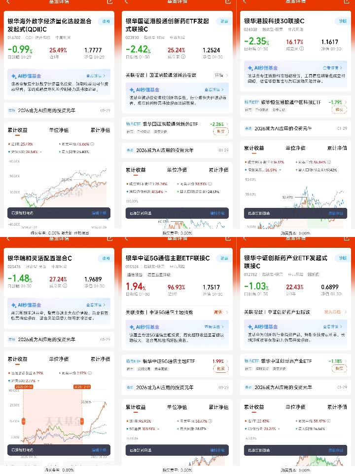 再说说我的养基经历,当初踩过的坑,让我更坚定了“专业工具+长期定投”的思路。2023年的时候,我看着AI概念火,就跟风买了两只重仓港股科技股的主动基金,结果因为基金经理调仓太频繁,加上自己忍不住追涨杀跌,一年下来不仅没赚钱,还亏了15%。后来才明白,自己既不懂港股的估值逻辑,又把握不好行业轮动节奏,盲目跟风根本就是送钱。2024年初,我开始关注指数基金,对比了好几只后选了银华港股科技30联接C,原因很实在:一是它的成分股都是港股科技里的核心资产,科技纯度高,不会被杂七杂八的非科技股稀释收益;二是C类份额没有申购费,持有7天以上赎回费也很低,长期定投成本划算;三是银华基金是老牌子,指数跟踪能力靠谱,不用怕跑输大盘。