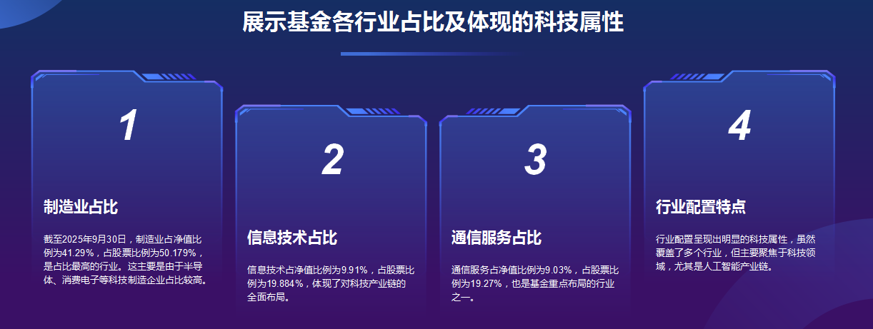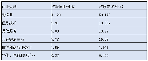 行业配置呈现出明显的科技属性,制造业占比最高(41.29%),这主要是由于半导体、消费电子等科技制造企业占比较高;信息技术(9.91%)和通信服务(9.03%)也占比较高,体现了对科技产业链的全面布局。