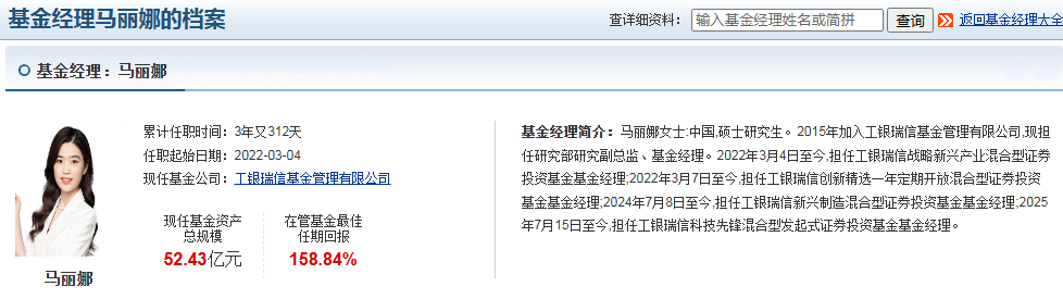 工银科技先锋混合发起式C的基金经理为马丽娜,她于2025年7月15日开始管理该基金。马丽娜女士拥有硕士研究生学历,2015年加入工银瑞信基金管理有限公司,现担任研究部研究副总监、基金经理。她的专业背景尤为突出,本科毕业于北大微电子系,硕士毕业于北大计算机系,为其在科技领域的投资奠定了坚实基础。
