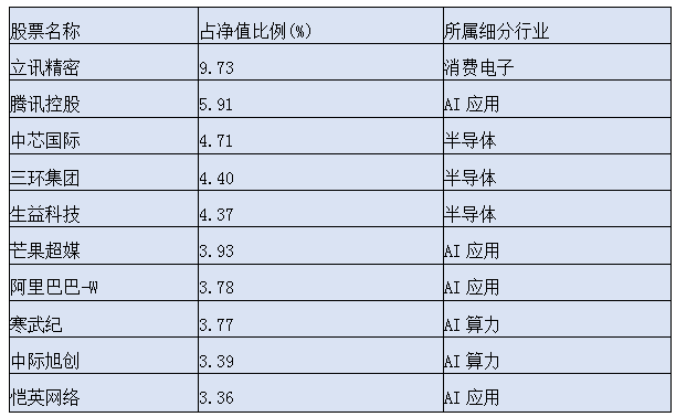 AI算力领域:寒武纪(3.77%)、中际旭创(3.39%)等,合计占比约7.16%