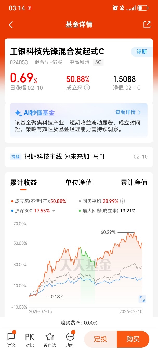 #把握科技主线#我看好024053工银科技先锋混合C,它聚焦科技成长主线,重点布局电子、算力、消费电子等高景气方向,贴合新质生产力与AI产业浪潮。基金经理深耕科技赛道,选股能力突出,持仓聚焦龙头,业绩弹性充足。C类份额持有成本更低,适合中长期定投。当前科技板块估值合理,政策与产业双轮驱动,未来成长空间广阔,是把握科技行情、分享行业红利的优质选择。