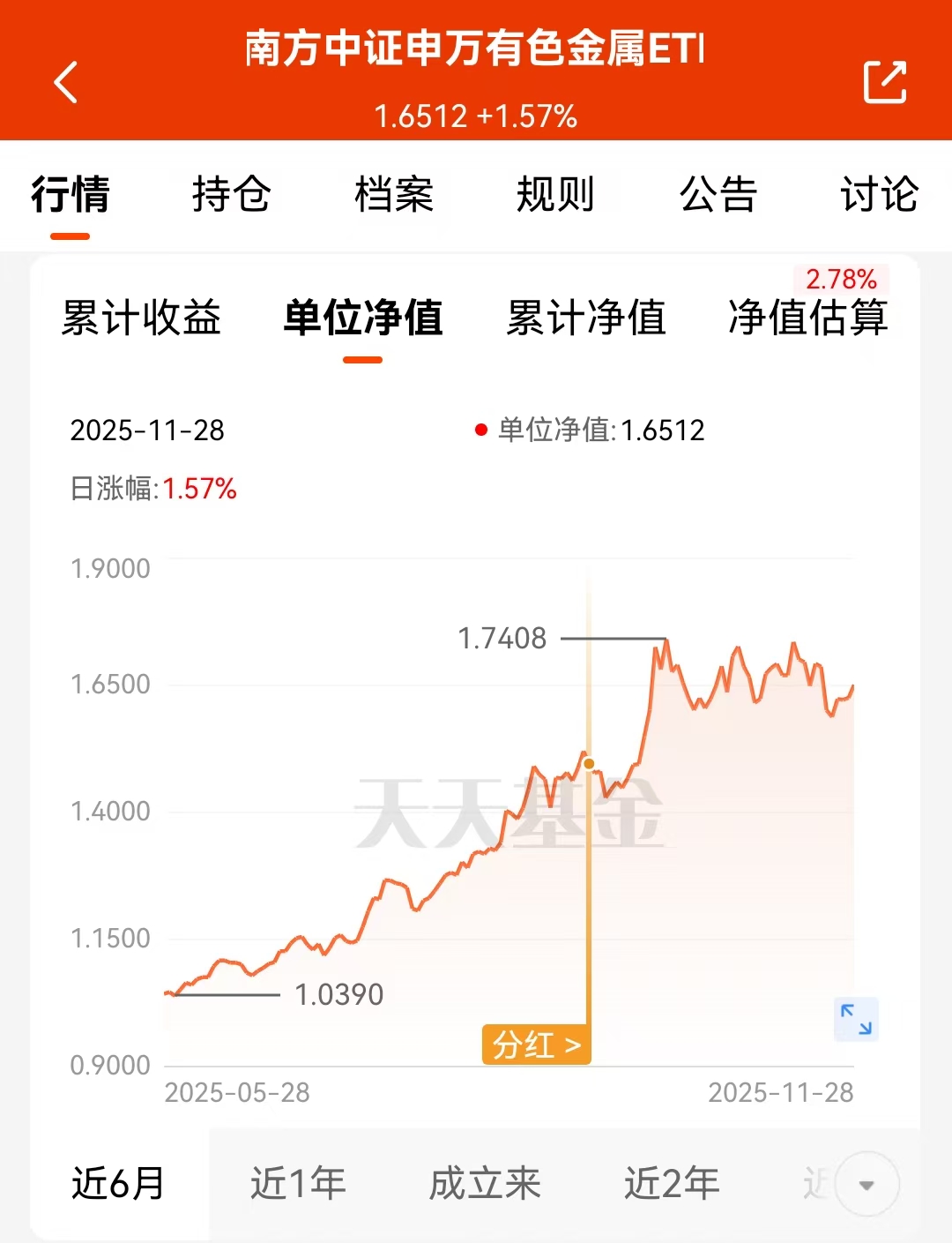 今天继续加仓$南方中证申万有色金属ETF发起联接C$(004433)!别看大盘反复震荡,有色板块今天又冲在前面,基金净值也回到1.65以上了。今年以来这类资产涨了70%多,但我觉得还没结束。现在很多信号都对资源品有利——比如海外流动性预期改善,国内经济数据也在好转,传统基建和新兴科技都离不开金属。这基金前十大重仓里覆盖了金、铜、锂这些硬通货,分散风险的同时也不错过板块轮动。最近三个月它涨了18%,同类排名前200,说明资金还在持续流入。#11月我的投资总结!#