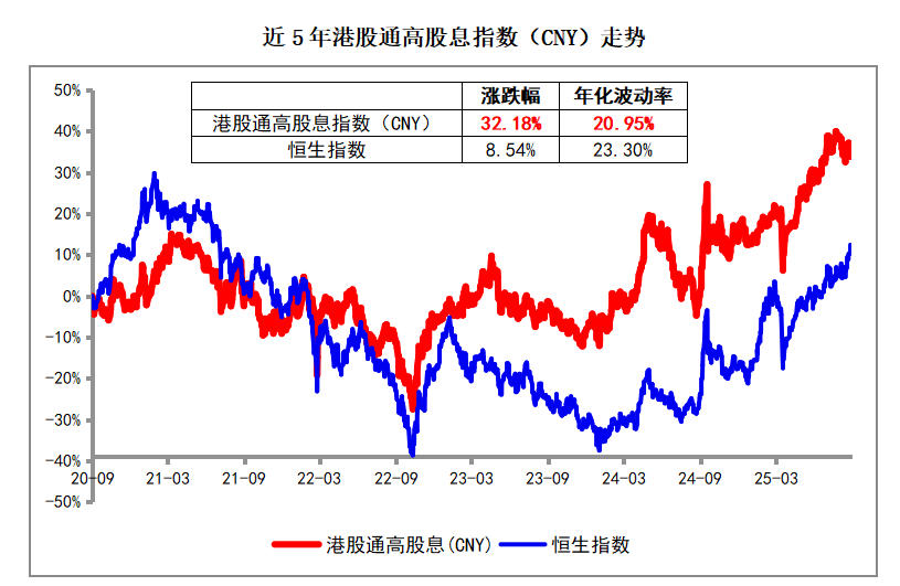 (数据来源:Wind,统计区间:2020年9月20日-2025年9月19日。港股通高股息指数、恒生指数期间年化涨幅分别为5.81%、1.68%,指数过往业绩不代表其未来表现,不等于产品实际收益,投资需谨慎。)