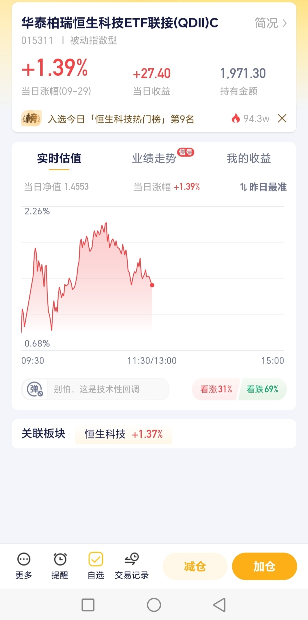 今天恒生科技指数涨了1.37%,华泰柏瑞也涨了1.39%,国庆期间港股不休息,虽