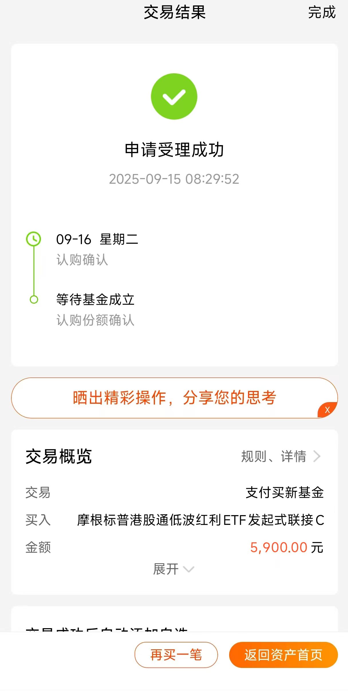 降息本周成了现实,市场风险偏好有所提升。但在参与市场的同时,我始终记得要管理好组合的波动,$摩根标普港股通低波红利ETF发起式联接C$(024773)这样的红利产品就派上用场了,它波动相对小,能帮我稳定持仓收益。我看好港股红利的原因在于,港股作为离岸市场,其流动性更容易受到全球流动性宽松的正面影响。可以说是同时抓住了“三大当前市场的关注点。不过市场也面临一些可能改变节奏的变量,比如美联储后续政策的预期差、一些国际谈判进程的不确定性、国内政策力度的预期修正等。如果风险市场出现超预期的负面情况,那么获利盘了结可能导致市场震荡,这个产品相当于让50家港股市场上的现金奶牛公司替你工作,有望实现季度分红。其跟踪的指数具有高股息特征(股息率5%以上),港股市场目前关注度较高,指数成份股中央国企浓度高(超50%),这些都增加了其吸引力。强化组合配置红利资产的原因在于抵御波动,本周降息给予了港股较好的上涨预期,选择摩根这只新基金顺势而为且行稳致远。#指数操盘手集结令#