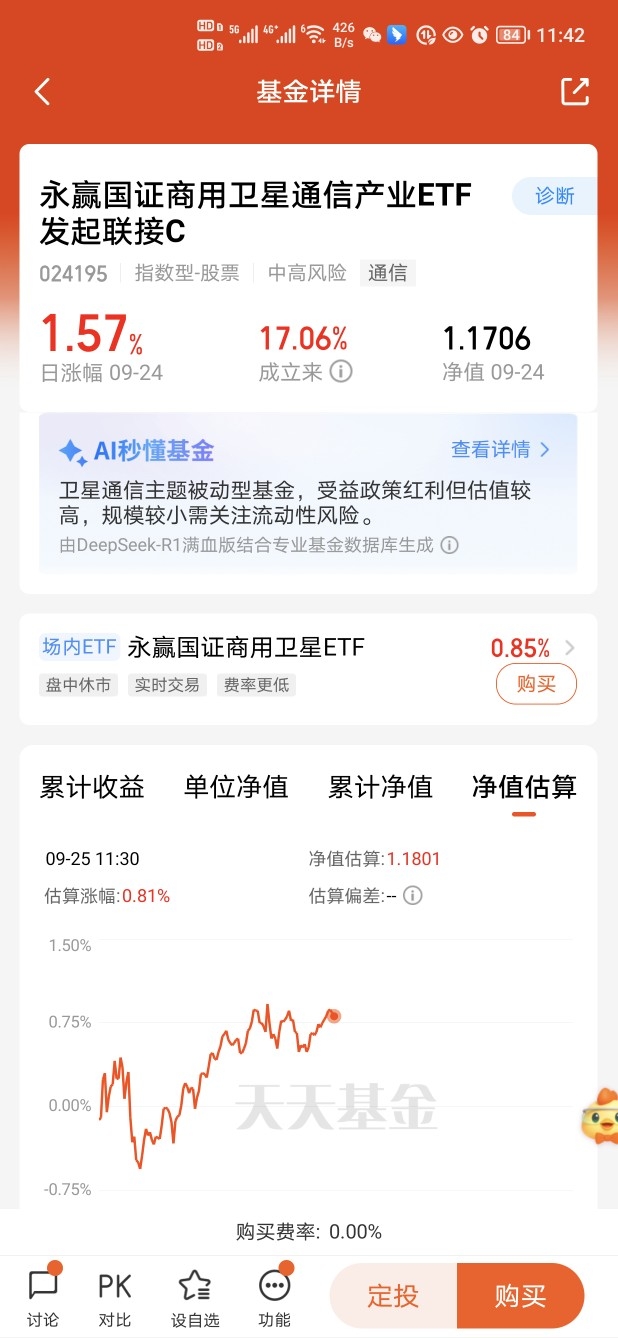 优质赛道弹性挺不错的,$永赢国证商用卫星通信产业ETF发起联接C$ 昨天涨幅1.57%,成立以来,涨幅已经超过了17个点,在同类里的表现也是很不错。目前卫星产业正迎来技术+利好+需求的三重共振。技术层面,可回收火箭将发射成本降至传统方式的十分之一。机构预测2030年市场规模将突破4000亿美元。卫星通信是6G通信的技术基础底座,同时也为无人驾驶、低空经济、物联网等提供必要的基础支持。国内商业航天行业进入高峰发射期,卫星互联网低轨卫星组网发射任务密集进行#“924行情”一周年 你赚了多少?#