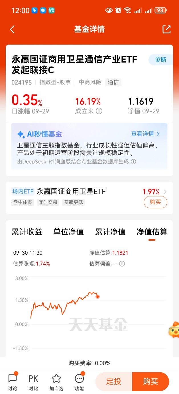 $永赢国证商用卫星通信产业ETF发起联接C$近四天有三天上涨了,看目前的估值今天