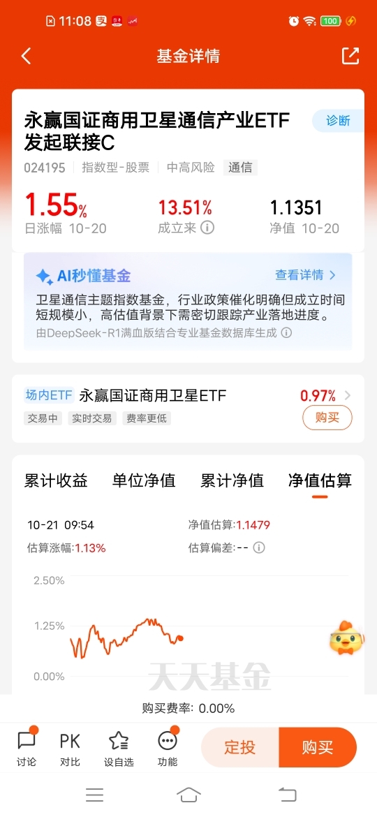 $永赢国证商用卫星通信产业ETF发起联接C$调整后机会来了,今天继续反弹,昨天涨