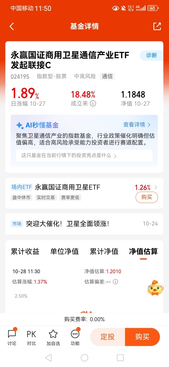 #美方“不再考虑”对中国加征100%的关税# 目前卫星产业正迎来技术+利好+需求的三重共振。技术层面,可回收火箭将发射成本降至传统方式的十分之一;卫星通信是6G通信的技术基础底座,同时也为无人驾驶、低空经济、物联网等提供必要的基础支持,现在开始着手布局$永赢国证商用卫星通信产业E TF发起联接C$ 也是不错呀,成立以来涨幅+18.48%