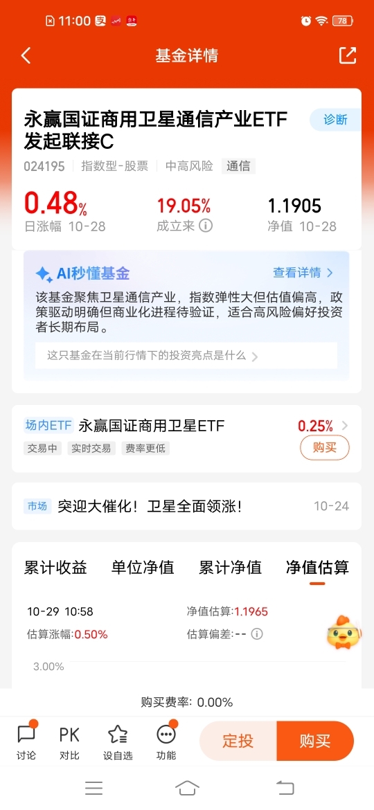 $永赢国证商用卫星通信产业ETF发起联接C$昨天涨幅0.48%,成立以来累积涨幅