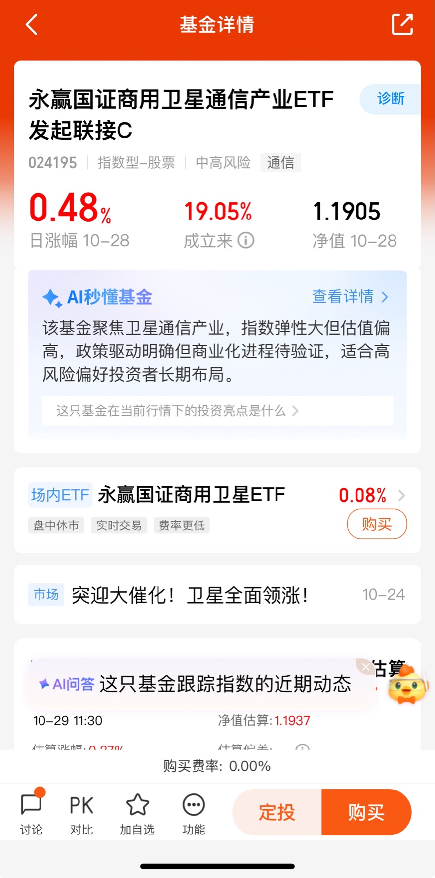 $永赢国证商用卫星通信产业ETF发起联接C$昨天收0.48%,近一周收3.66%