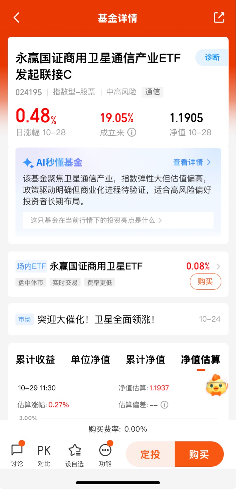 #A股突破4000点!下个目标位在哪?# $永赢国证商用卫星通信产业ETF发起联接C$ 昨天逆势上涨0.48%,成立三个月多月成立以来收益19.05%,作为国内首只聚焦卫星通信产业链的ETF联接基金,重点布局卫星制造、发射及商用通信服务环节,与当前卫星互联网建设加速的政策方向高度契合。我国卫星发射频率显著提升,相关产业链企业受益于低轨卫星组网需求,基金可通过跟踪指数分享产业成长红利。