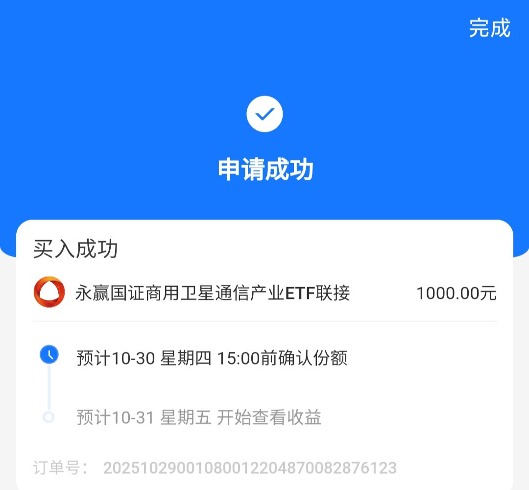 今日买入1000元$永赢国证商用卫星通信产业ETF发起联接C(OTCFUND|024195)$,该基金紧密跟踪卫星通信指数,之前卫星通信已经连涨三天,该基金也连续三天上涨,今天冲击四连涨,卫星通信产业上涨的原因一方面是大盘持续上攻,上证指数突破4000点,牛市继续,一方面是十五五规划新增航天强国,其中,以火箭与卫星为代表的空间基础设施及应用有望成为“航天强国”下的重要发展领域。这将会明显加快卫星通信产业发展,是一个长期的利好,感觉这个行业潜力不小,我今天决定上车1000作为一个配置。