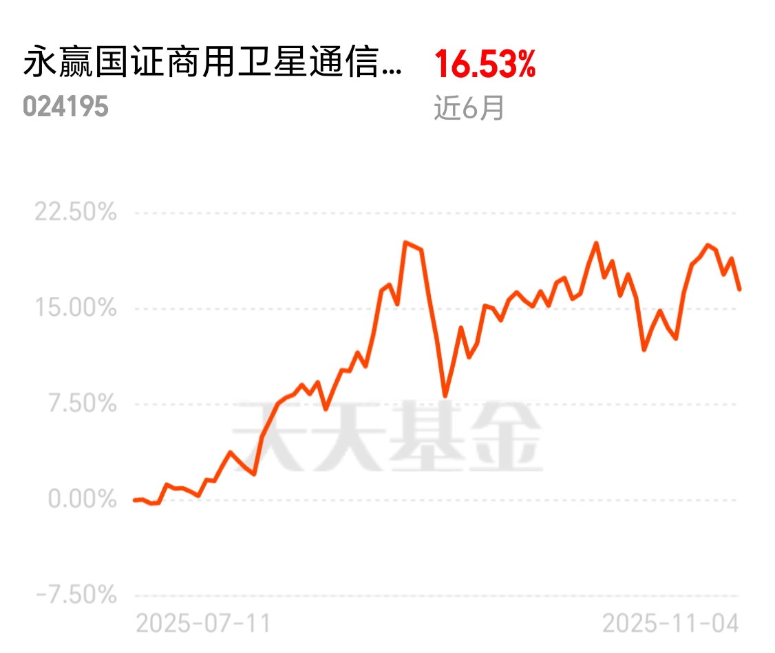 $永赢国证商用卫星通信产业ETF发起联接C$ 紧密跟踪商用卫星通信指数,覆盖卫星制造、通信、导航等核心领域,契合国家战略新兴产业发展方向。 看业绩,成立117天以来,收益16.53%,目前,卫星互联网赛道行情正在起步阶段,我准备择机配置起来。$永赢国证商用卫星通信产业ETF发起联接C$