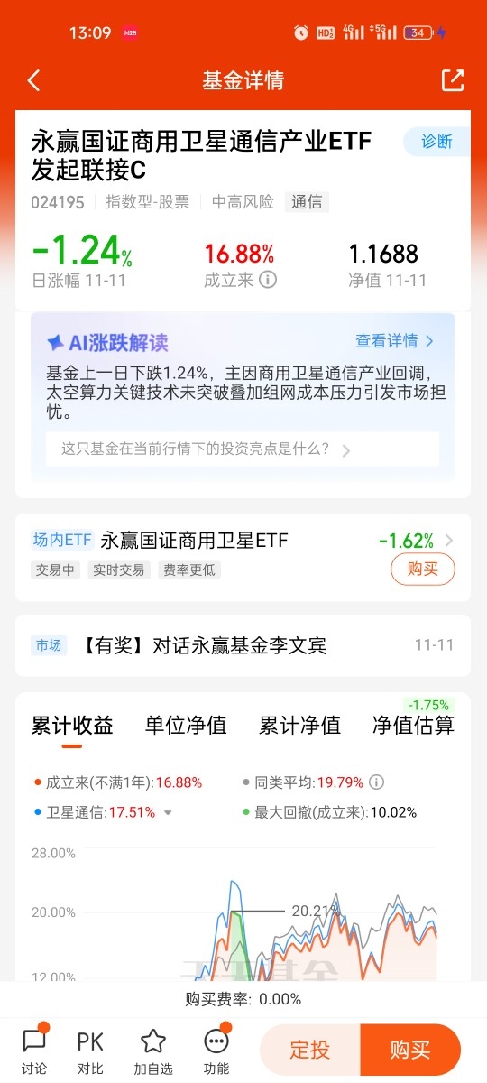 今天A股震荡向上,卫星互联网方向最近上行了很多,基金有点波动也正常,可以趁今天回调上车永赢卫星通信产业C024195,近六个月收益率7.19%,持仓里是通信卫星方面的面的 ,发工资就上车,希望能吃肉吧。
