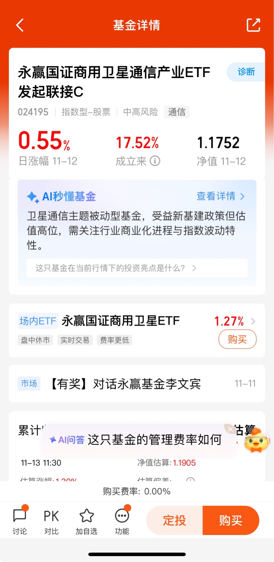 $永赢国证商用卫星通信产业ETF发起联接C$昨天收0.55%,近一周收1.26%
