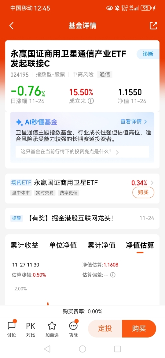 #今年买基金赚了多少钱?# 卫星互联网涵盖应急救援、低空经济、智能交通、农业监测等领域,与5G、物联网融合潜力大,市场空间广阔;$永赢国证商用卫星通信产业ETF发起联接C$ 成立四个月多月成立以来收益12.66%,作为国内首只聚焦卫星通信产业链的ETF联接基金,覆盖通信、导航和应急救援、低空经济等领域。
