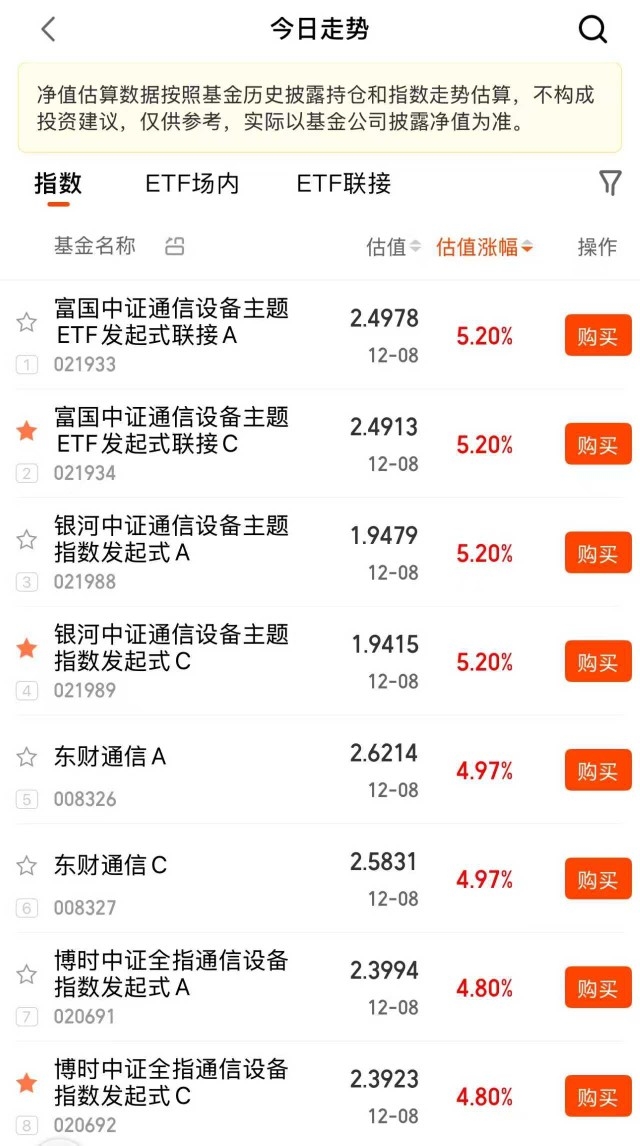 这阵子卫星通信那块涨得不错,也押注永赢国证商用卫星通信产业ETF联接C,但更看中富国中证通信设备主题ETF联接C的布局它不光有CPO龙头,还覆盖军工通信和卫星互联网,双重逻辑更扎实;今天基金预估大涨,在同类里面领先,近1个月涨了8%,近6个月更是冲了92%,跑赢大多数同类型产品;今天基金预估大涨,在同类里面领先,而且它还是全市场持有中兴通讯、中际旭创最多的基金,配置起来心里更有底。