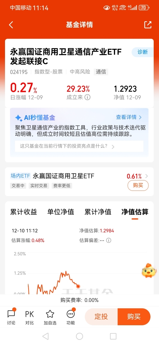 $永赢国证商用卫星通信产业ETF发起联接C$ 聚焦卫星通信产业链,昨日上涨+0.27%;近一年涨幅+29.23%;对应的卫星E TF是唯一规模突破12亿元的国内卫星主题ETF,近期商业航天、卫星通信行业催化不断。商业航天产业或已处于爆发前夜,卫星通信是6G通信的技术基础底座,未来可期,板块空间广阔,趁着估值仍处于低位,值得关注了!#2025即将收官 明年怎么投?#
