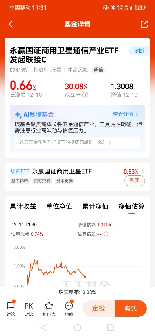 $永赢国证商用卫星通信产业ETF发起联接C$ 聚焦卫星通信主题ETF链接基金,跟踪的卫星ETF是全市场首只、稀缺性比较强的,昨天涨了0.66%,成立以来涨幅+30.08%,状态不错呀!这里刚成立不久,从净值表现来看,这里波动小,回撤控制的还是蛮给力的!目前板块估值仍处于低位,还是很值得期待了!#美联储宣布降息25个基点 如何布局?#