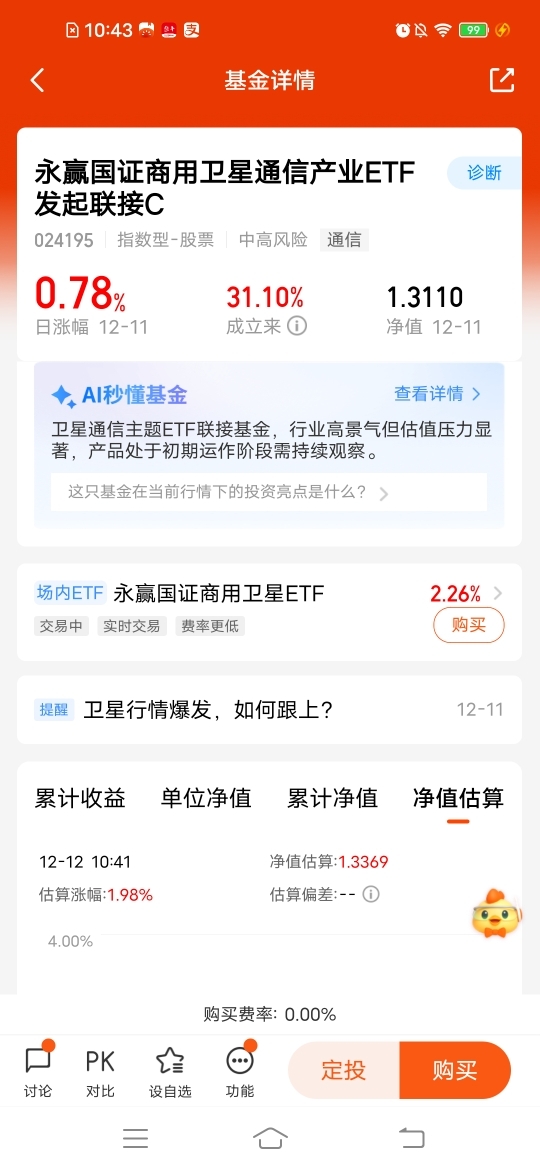 $永赢国证商用卫星通信产业ETF发起联接C$目前估值涨幅2个点左右,卫星赛道持续
