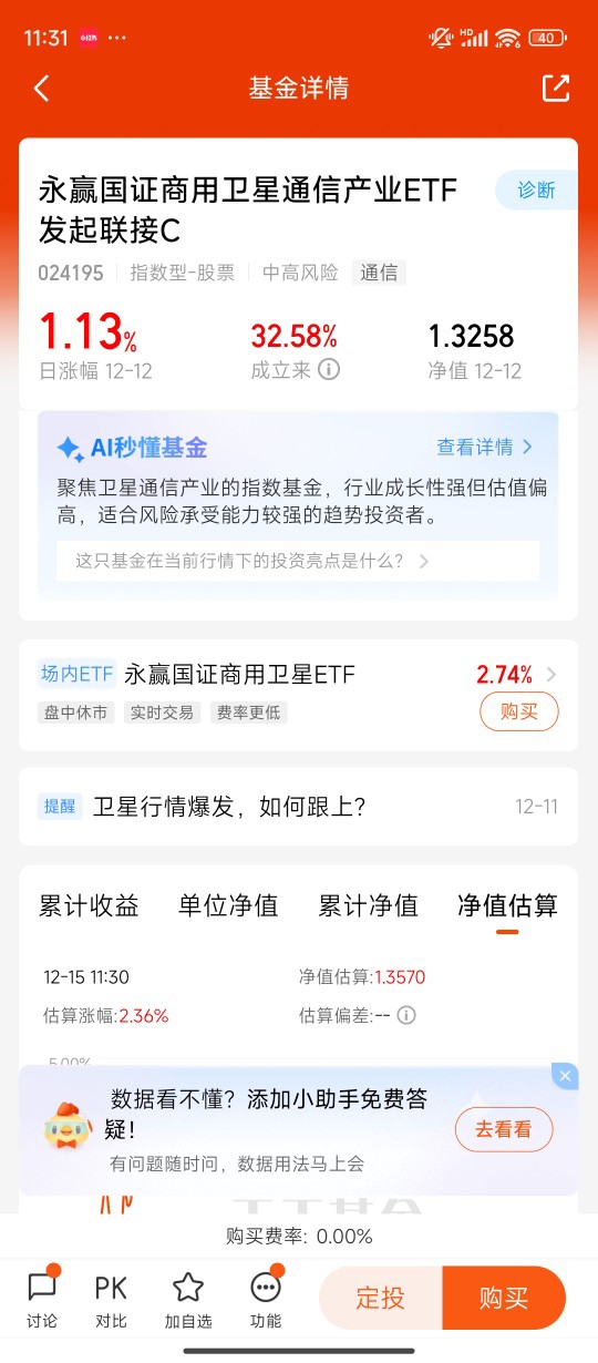 #茅台批价两日涨近百元!白酒挤泡沫结束?#卫星通信产业近期呈现显著的上升趋势。$永赢国证商用卫星通信产业ETF发起联接C$周五拉涨1.13%,近一月涨幅12.81%。新基成立以来涨幅达到32.58%,兼具超额收益能力和风险控制能力。 指数成分股覆盖卫星制造、运载火箭、地面设备及运营服务等全产业链。商业航天作为新质生产力重点发展方向,技术突破叠加政策催化,地缘因素提升军工信息化需求,为爱好者提供了布局卫星工具化的选择。