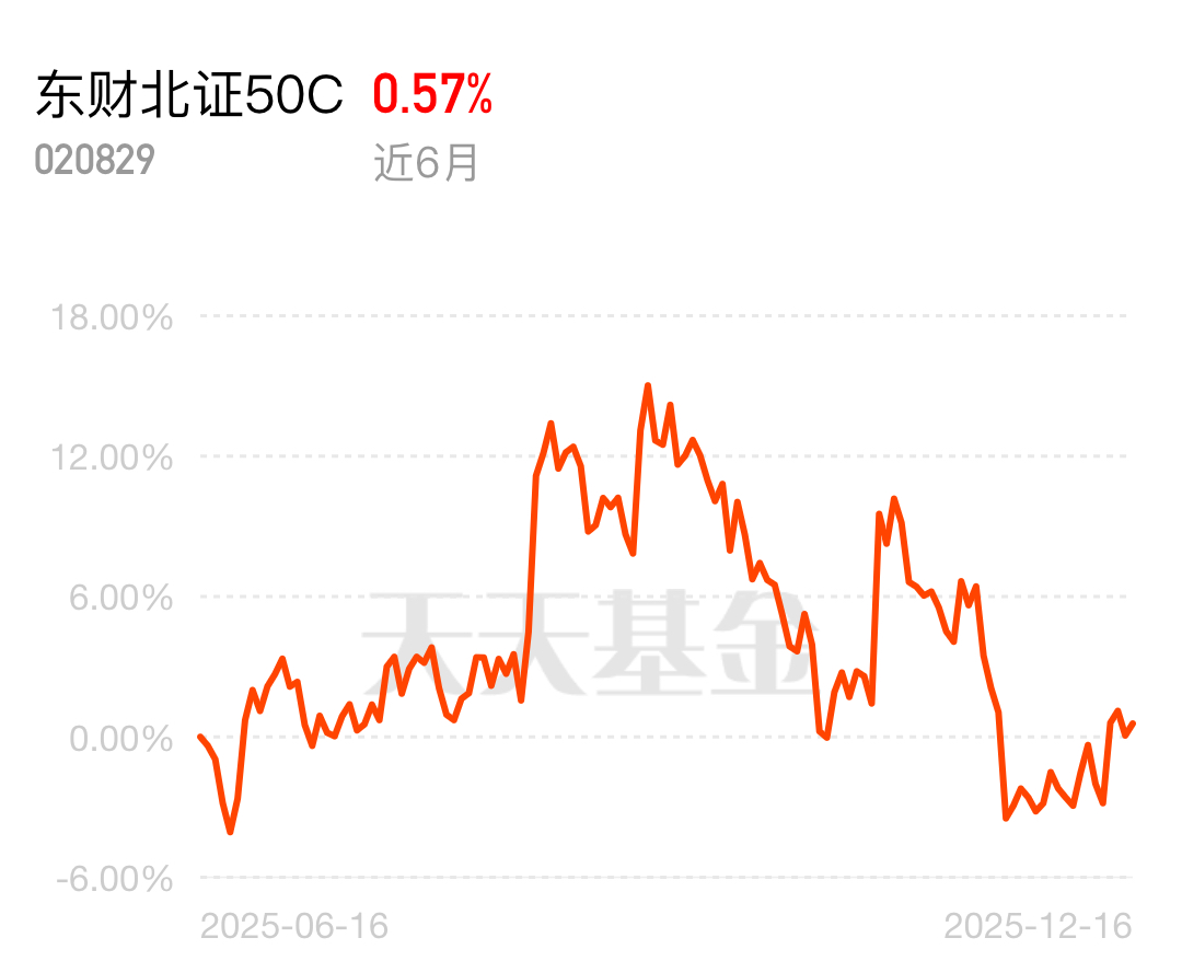 北证 50 从 9 月以来涨超 134%,成为宽基里最靓的崽,涨疯了。成分股覆盖 AI、新能源等高景气赛道,踩中所有热门题材,东财北证 50C 额度紧张,赶紧抢筹码,要么不涨要么疯涨,犹豫就拍大腿!$东财北证50C$