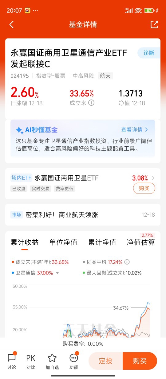 #长征十二甲要来了!商业航天如何掘金?#商业航天密集利好,$永赢国证商用卫星通信产业ETF发起联接C$ 今晚涨幅2.60%。也是涨幅领头羊之一呀。近一月涨幅13.94%。成立以来涨幅达到33.65%。聚焦卫星制造、火箭发射、地面设备及运营服务全产业链。赛道在政策加持下商用加速,是全市场稀缺场外标的,C类免申购费,分散个股风险,捕捉产业红利的便捷工具!