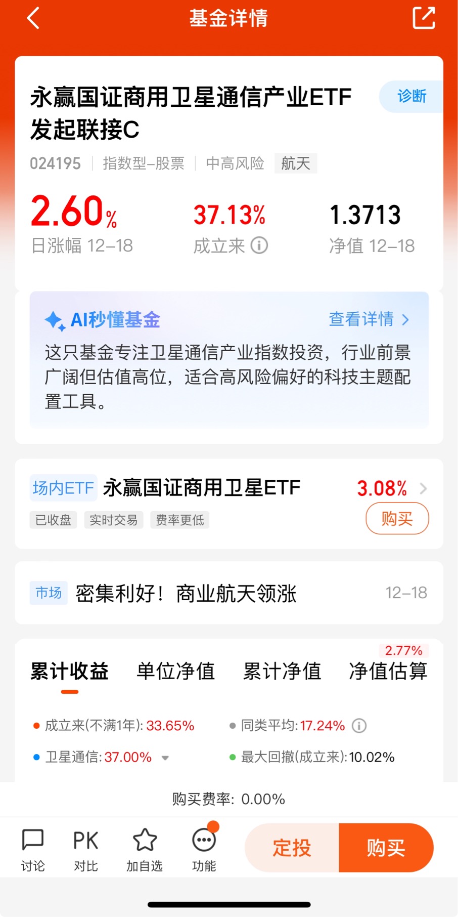 $永赢国证商用卫星通信产业ETF发起联接C$今天收2.60%,近一个月收18.5