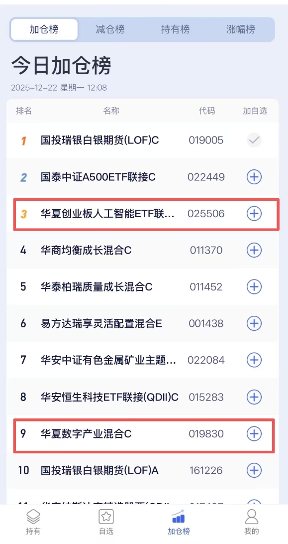 一个$华夏创业板人工智能ETF发起式联接C$,一个$华夏数字产业混合C$,今天加仓榜前十的俩华夏基都是我手里的重点基啊,加上今天行情走高,这俩基金估计至少都能有3个点,期待两个加起来给我8%不过份吧,妥妥的大吃肉,爽了
