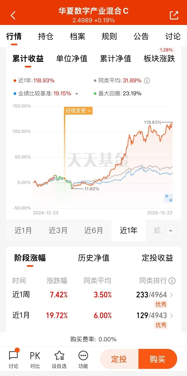 AI算力需求持续扩大,这基聚焦数字经济产业,增长空间还是很大的,近一年收益119%,在全市场18000多只基金中排前1%,跑赢基准近99%个点,超额优秀,得多布局一些$华夏数字产业混合C$