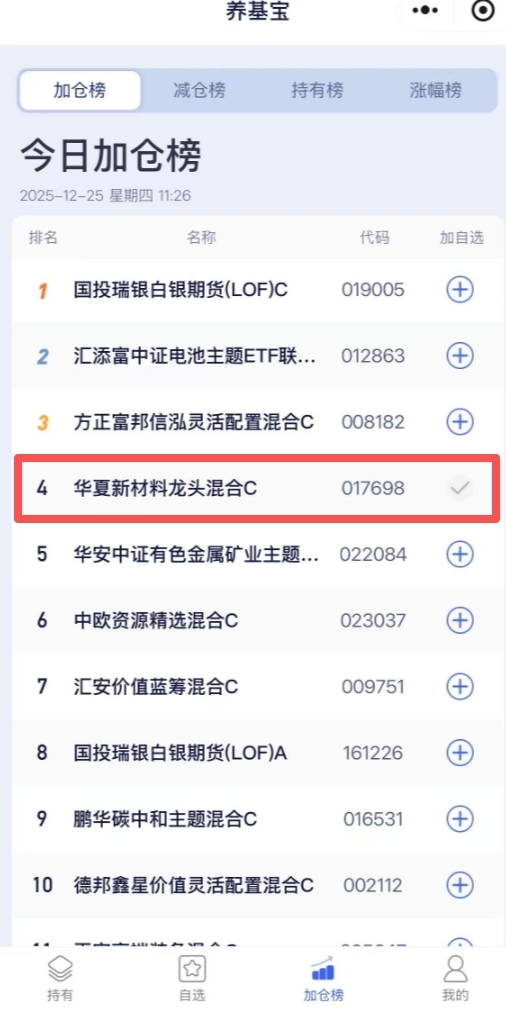 上车最好的时机到了,这里连红3天,3天收益超11%,实在看着心动,今天市场回调就是倒车接人,今天直接冲上加仓榜第4了,跟着大资金的节奏给机会就上$华夏新材料龙头混合发起式C$