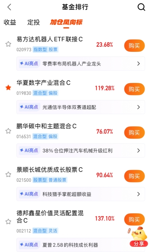 观察一周$华夏数字产业混合C$,发现这基的增收能力和反弹力都不错,近一周收益有5.88%,近一年收益有119.28%,短期和中长期收益都亮眼,各阶段排名都很优秀,今天从加仓风向标看到的,上车试试