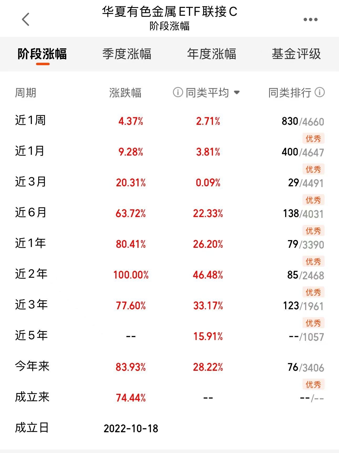 今天上涨3%+,近5天中有4天上涨,短期反弹持续性不错,近3个月收益20%+同类排名前1%,$华夏有色金属ETF联接C$夏普比率3.03,优于99%同类,加上D份额还有7天免赎回费,性价比都不错,这上涨趋势必须拿住$华夏有色金属ETF联接C$$华夏有色金属ETF联接D$