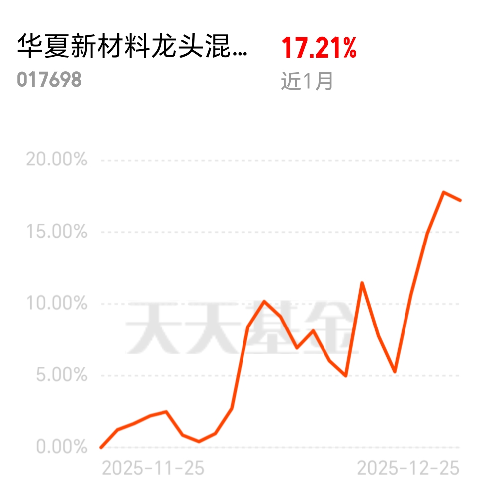 前几天一直看它涨,3天连涨收益都超11%了,昨天终于小回调所以今天开盘就上车了,$华夏新材料龙头混合发起式C$近一个月也有17%+的业绩,近一周近9%的业绩直接同类排名前1%,重点布局的AI新材料弹性也足,今天就是机会