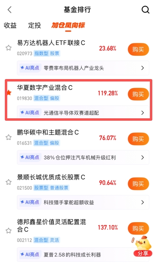 近一年收益119%+,同类排行前1%(35/4432),最近爆发力也强,近一个月业绩超19%,这几天已经持续在平台加仓榜了,资金都在布局,毕竟数字产业的前景众所周知,新年来临我先加了$华夏数字产业混合C$